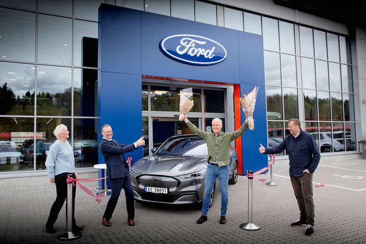 Einar Flåte Norges første Mustang Mach-E kunde 2021, fv. informasjonsdirektør i Ford Motor Norge, Anne Sønsteby, administrerende direktør i Ford Motor Norge, Per Gunnar Berg, Einar Flåte og adm. dir i Røhne Selmer, Kjetil Hagestande