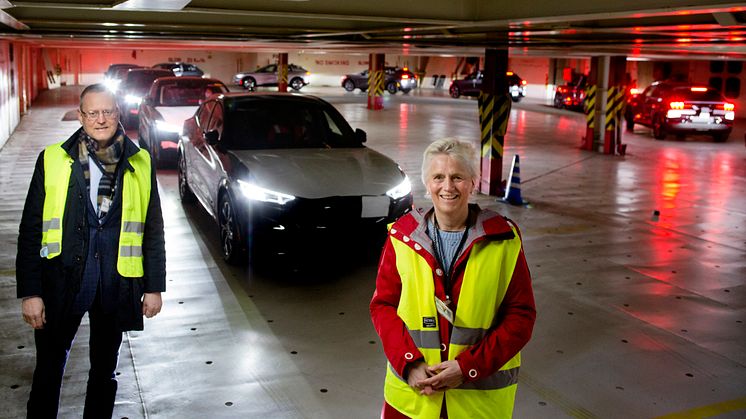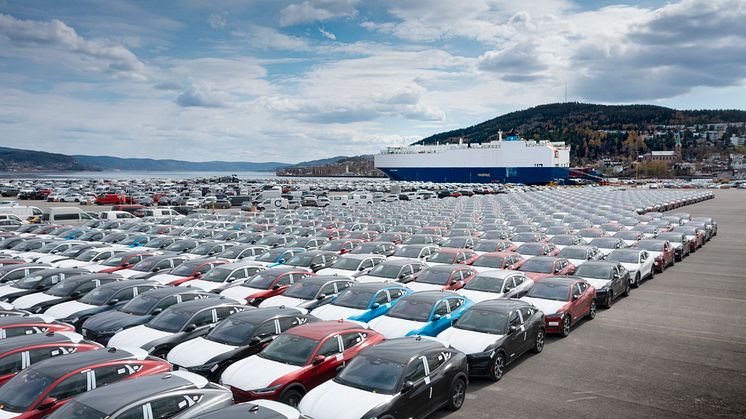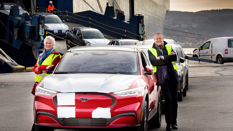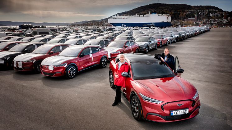 • Administrerende direktør Per Gunnar Berg og informasjonsdirektør Anne Sønsteby i Ford Motor Norge, Drammen Havn 28. april 2021 Mustang Mach-E