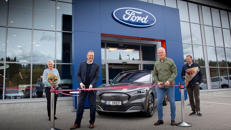 • Einar Flåte Norges første Mustang Mach-E kunde 2021, fv. informasjonsdirektør i Ford Motor Norge, Anne Sønsteby, administrerende direktør i Ford Motor Norge, Per Gunnar Berg, Einar Flåte og adm. dir i Røhne Selmer, Kjetil Hagestande
