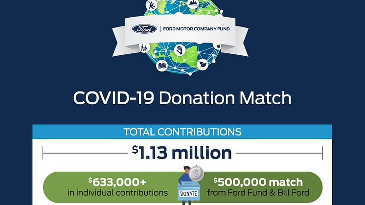 Programmet «The COVID-19 Donation Match» ble lansert i april. Målet var å gi Fords ansatte, deres venner og familie en mulighet til å hjelpe til i kampen mot den stadig voksende globale pandemien, samtidig som de oppholdt seg hjemme og var ute av stand til å delta i vanlig frivillig arbeid.