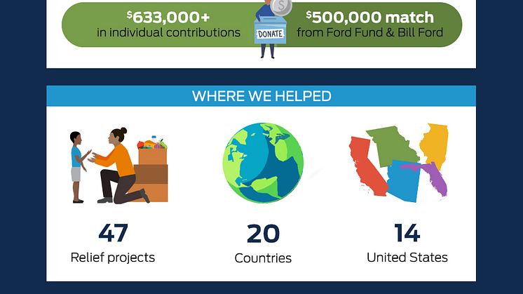 «The COVID-19 Donation Match» er bare ett av mange eksempler på hvordan Ford Fund hjelper lokalsamfunn med kritisk hjelp til pandemirelaterte utfordringer. Så langt har de delt ut nesten 3 millioner dollar til ideelle organisasjoner over hele verden. Les mer om Ford Funds innsats mot COVID-19 her: www.fordfund.org/covid19.
