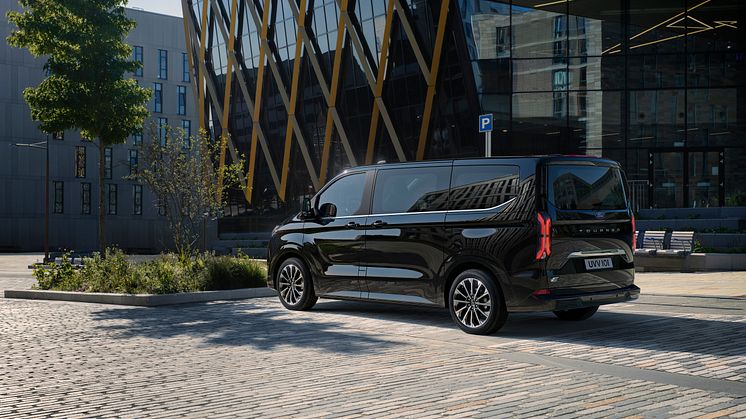 Den nye modellen kan fås med plass for inntil åtte personer samtidig som den har godt med bagasjeplass. E-Tourneo Custom kommer med en rekke premiumløsninger, som svært fleksible bakseter montert på skinner, elektriske sidedører, et premium B&O lydsystem, digitale nøkkelkort, panoramatak og et innovativt ratt som kan foldes til et lite bord.