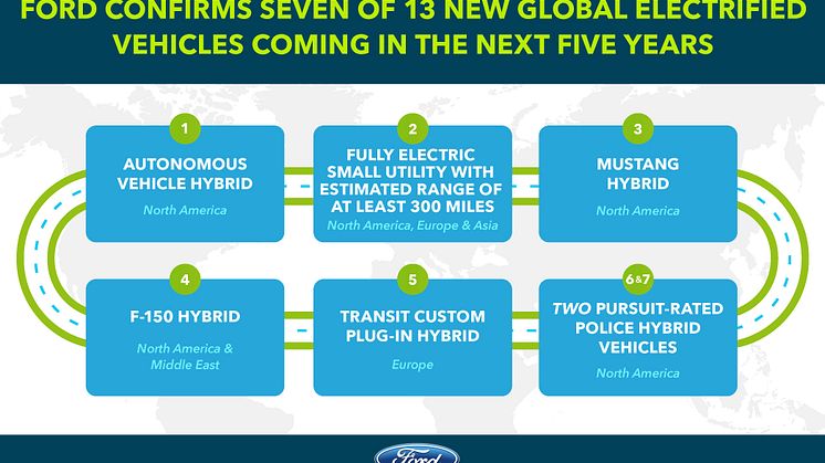 - Ford kunngjorde i dag 7 av de 13 nye globale elektrifiserte bilene som lanseres i løpet av de neste fem årene, inkludert hybridversjoner av bestselgeren F-150 pickup og ikoniske Mustang i USA, en plug-in hybrid Transit Custom varebil i Europa og en hel-elektrisk SUV med en forventet rekkevidde på minst 482 km for kunder globalt.