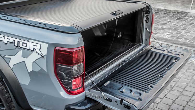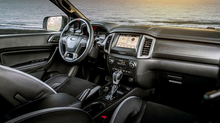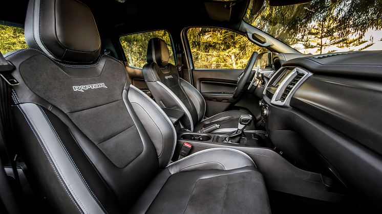 Innvendig er Ranger Raptor en modell som oser av Ford Performance-DNA. De forsterkede setene er spesialdesignet for kjøring i høy fart i tøft terreng og har ekstra god og fast polstring og ruskinnstoff for best mulig sittestilling. I hele kupeen er det utstrakt bruk av blå sømmer og lærdetaljer. Manuell girhendler i magnesium bak det skreddersydde rattet med den særegne Raptor-logoen bidrar også til å gjøre Ranger Raptor til noe helt utenom det vanlige.